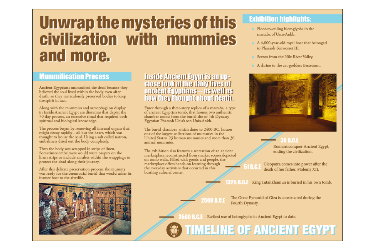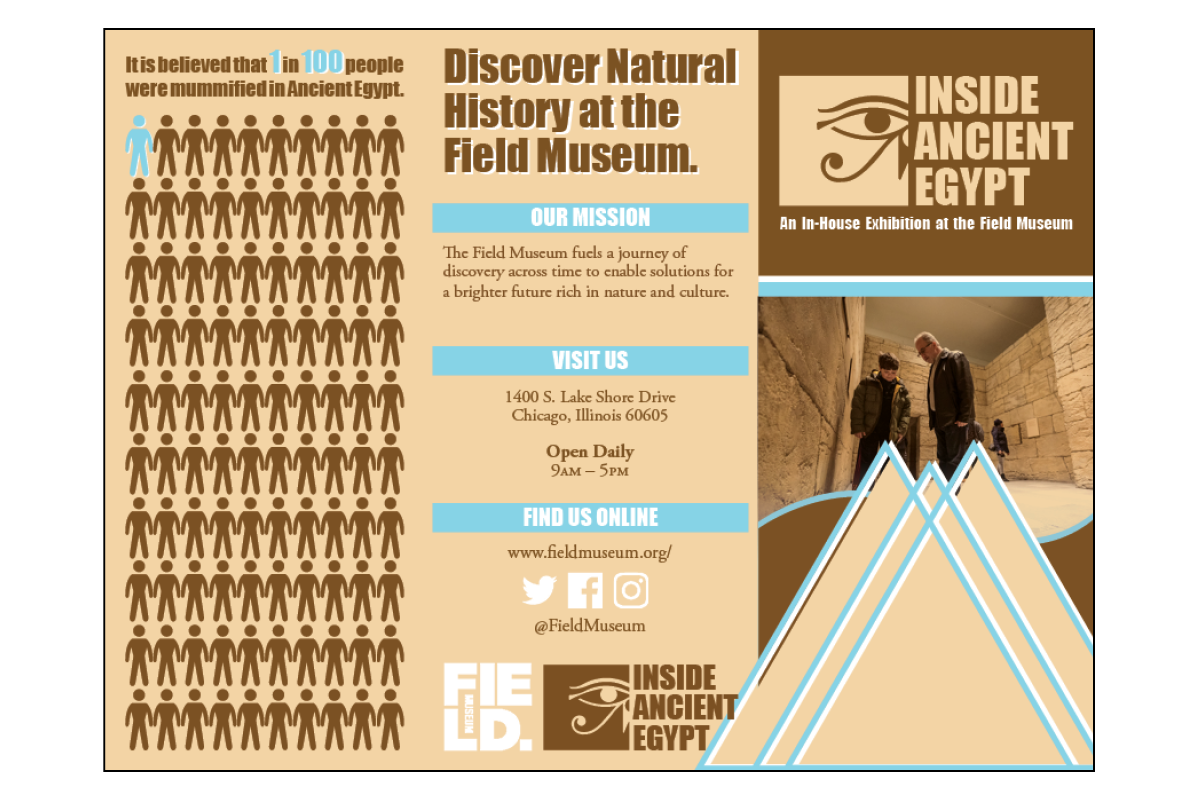 This tri-fold brochure is for an exhibit, Inside Ancient Egypt, located at The Field Museum in Chicago, Illinois. The target audience for the brochure is older kids and adults. It includes a new logo for the exhibit, an infographic, a timeline, photography, copy about the exhibit and basic museum information.