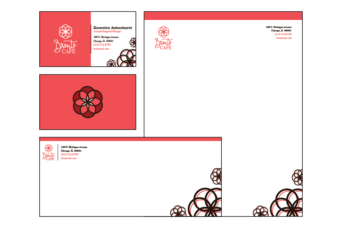 The business system designed for Brontë Café features the pink, brown and cream color palette as well as the full logo in both one color and its full color form. The typography of which the contact information appears on all three remains consistently placed through out all three pieces, with the single color logomark also consistently appearing in the bottom right corner as a decorative flourish. The full color logomark appears on the back of the business card, which is also seen on a multitude of collateral throught the project. The red and cream stand out against the pink so beautifully to give it a memorable look.