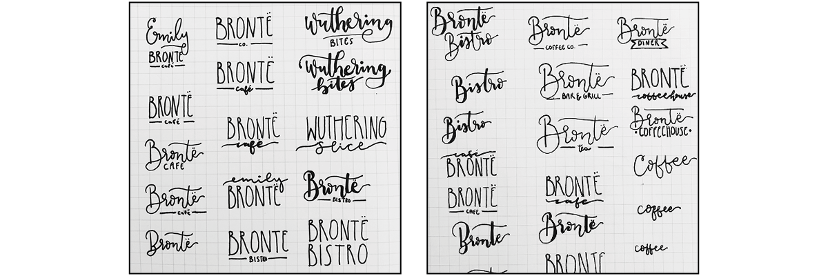 These are two pages from my personal sketch book when I was working on the logotype for this branding project. I had several names that I liked, so I hand lettered each option before I decided which one was best suited for the demographic and paired museum. The final hand lettered "Brontë" actually came directly from these sketches.