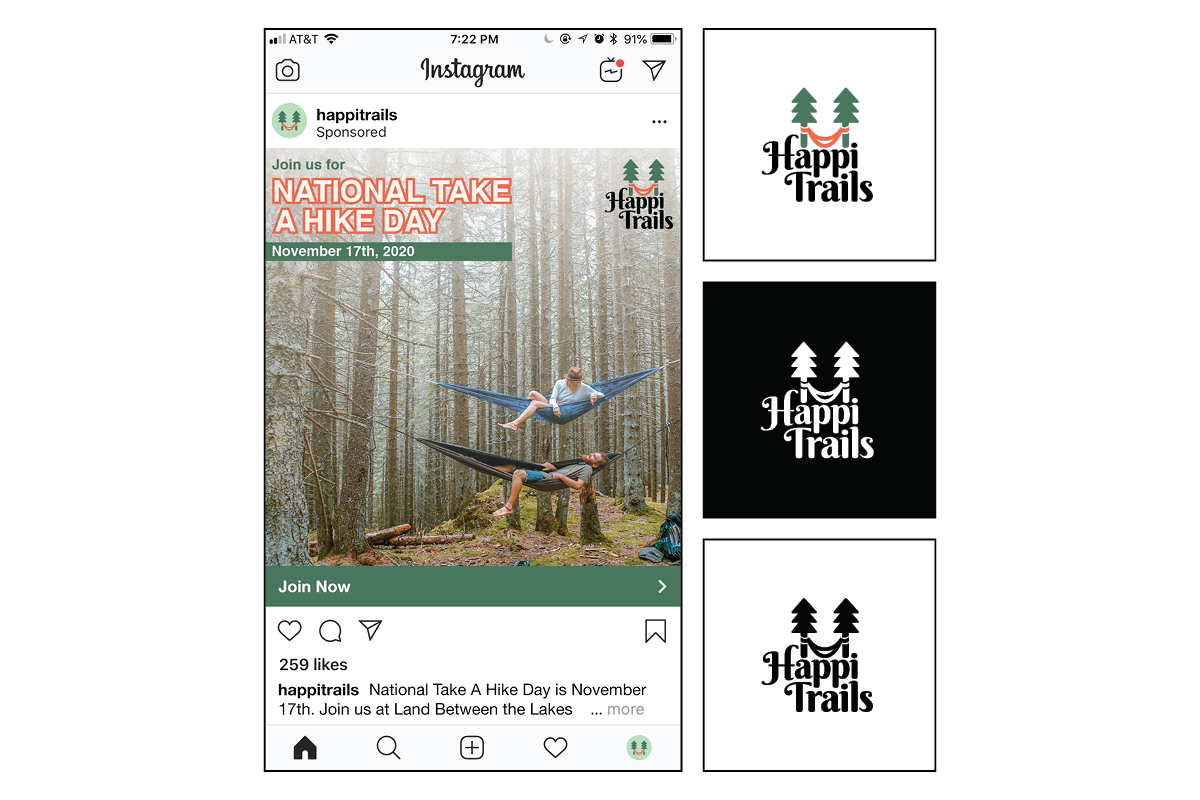 This instagram ad was created for a camping company as an independent branding project. It features the logo, which is a smiling hammock tied to two trees, a brand color palette of greens and oranges, and a photograph that reflects the brand values and target audience. It also has an enticing message and copy to get people active and outdoors that will draw the audience to their brand.