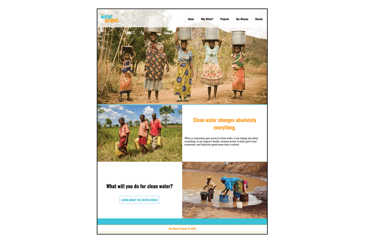 This class assignment was a web design-focused project. For this project, a brand redesign was necessary for The Water Project and a website rebuild using Dreamweaver for HTML & CSS. Along with a new logo and colors, the assignment also includes an icon set, infographics and photography to reinforce the brand vision and mission, all featured on the website.